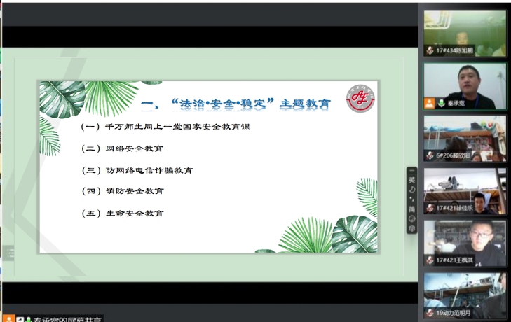 为进一步在学生中开展法治安全教育,确保安全意识入心入脑。申慱sunbet网站于4月17日晚分年级开展“法治•安全•稳定”线上主题教育活动,年级辅导员主持活动。