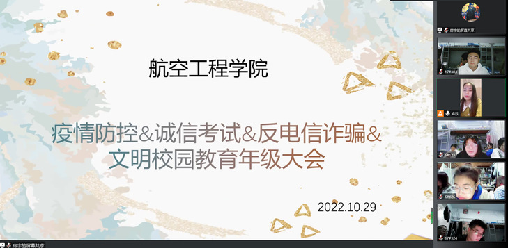为切实做好大学生网络文明素养教育工作,努力营造清朗、文明的网络空间,引导学生正确用网、理性发声,形成规范的网络行为。10月29日晚,申慱sunbet网站以线上腾讯会议的方式召开“提升网络文明素养,做新时代文明大学生”主题年级大会,各年级辅导员主持大会,全体同学参加了会议。